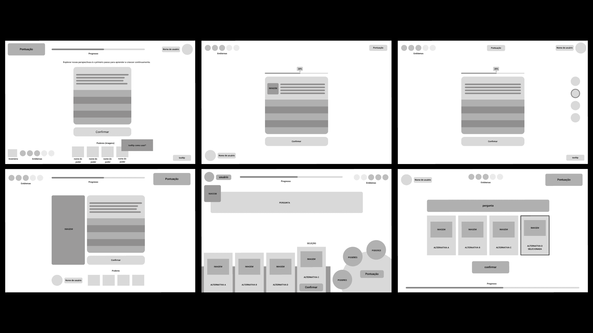 Desenvolvi protótipos testando diferentes abordagens. Fiz modelo de jogo de cartas, tentei formatos mais elaborados, até chegar num quiz com narrativa lúdica que fazia mais sentido para o produto e para o usuário. Trabalhei diretamente com o product manager e o desenvolvedor pra garantir a viabilidade técnica e o alinhamento com o roadmap.